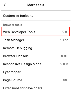 • Click the Firefox menu (the three lines in the top-right corner) and select “More tools” then “Web Developer Tools”.