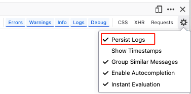 • Check the box for “Persist logs” to ensure the log is kept after page reloads.